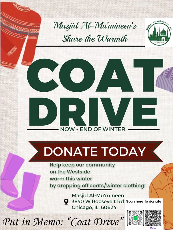 Masjid Al-Mu’mineen is hosting a Coat Drive from now until the end of winter. Let’s keep our neighbors warm by donating new or gently used coats, hats, gloves, and winter gear.